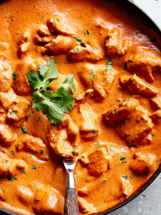 Die Zwiebel klein hacken und in 2 EL Butter glasig anschwitzen. Die passierten Tomaten, den Zimt, 1 TL Salz, 2 TL Cayennepfeffer, 1 Stück Ingwer und 1 Knoblauchzehe hinzugeben. Alles 20 Minuten mit Deckel und bei niedriger Temperatur köcheln lassen. Gelegentlich umrühren. Nun die restlichen 2 EL Butter, den Honig und die Sahne hinzufügen, weitere 3 Minuten köcheln. Das Fleisch aus der Marinade nehmen, in die Soße geben, kurz umrühren und 2 Minuten mitköcheln lassen.
