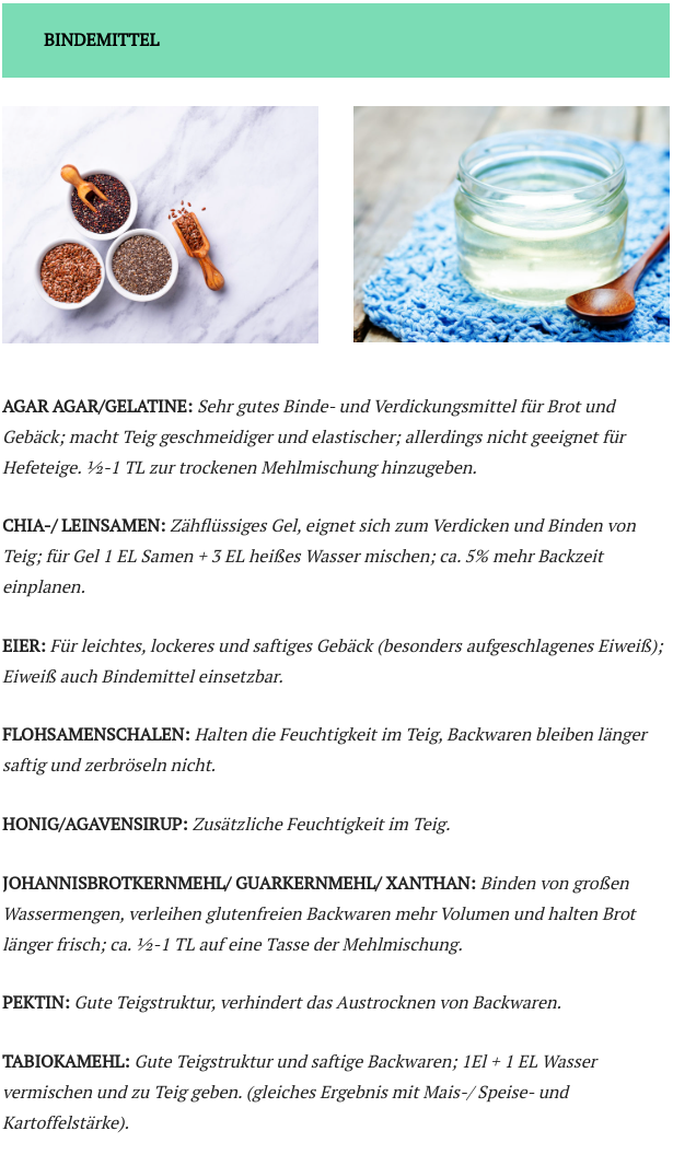 • JOHANNISBROTKERNMEHL/ GUARKERNMEHL/ XANTHAN: Binden von großen Wassermengen, verleihen glutenfreien Backwaren mehr Volumen und halten Brot länger frisch; ca. ½-1 TL auf eine Tasse der Mehlmischung.
