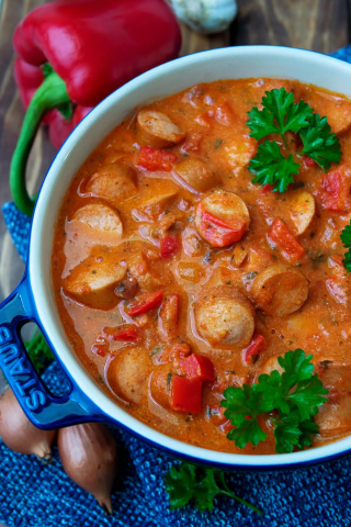 Als Erstes alle frischen Zutaten kleinschneiden, also die Würstchen, Zwiebel, Knoblauch und Paprika. Dann werden Zwiebeln, Knoblauch, Speck, Würstchen und Paprika in einem Topf angebraten. Und zum Schluss kommen dann noch die restlichen Zutaten, wie Tomatenmark, Brühe, gehackte Tomaten, Crème fraîche, Kräuter und Gewürze hinzu. Nun darf alles eine Weile vor sich hin köcheln.