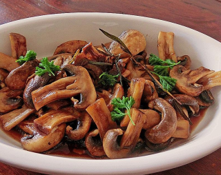 Olivenöl erhitzen, Knoblauch und Rosmarin kurz anbraten, dann die Champignons dazu tun und mit braten. Mit Balsamico und Salz abschmecken und auskühlen lassen. Mindestens einen halben Tag, besser noch einen ganzen, durchziehen lassen. Mit gehackter glatter Petersilie garnieren.