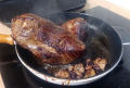 3. Jetzt wird der Braten in einem Topf auf dem Herd von allen Seiten scharf angebraten (klar, mit Fett im Topf). Ziel ist, dass das Fleisch keinen Saft mehr nach aussen verliert, wenn es spaeter im Ofen schmort. Den Braten danach ein wenig auskuehlen lassen.