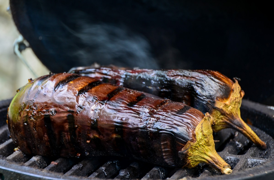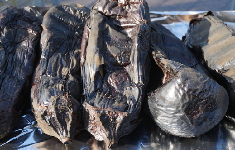 Zu erst werden die Vinete auf einem ordentlich heißen Grill so lange gegart, bis die Schalen aussen beginnen zu verkohlen. Das Fruchtfleisch ist weichgekocht, und Feuchtigkeit tropf aus den Vinete an Stellen, wo die Schale gerissen ist. Die müssen innen richtig weichgekocht sein. Bekommen sie nicht genug Hitze (und die Schalen verkohlen nicht), fehlt nachher der rauchige Geschmack. Braucht man den nicht, rteicht es die Vinete auch bei geringerer Hitze einfach weich zu kochen.