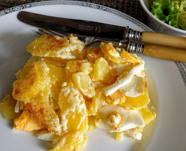 - 600 g Kartoffeln (fest kochende) - 5 Eier (hart gekocht) - 200 ml Rahm - Salz / Pfeffer nach Geschmack - 2 Esslöffel Semmelbrösel - etwas Butter