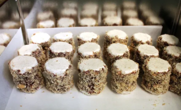 Eiweiß fest schlagen, Zucker einschlagen, Haselnüsse hineinheben und auf Teig mit Marmelade streichen.